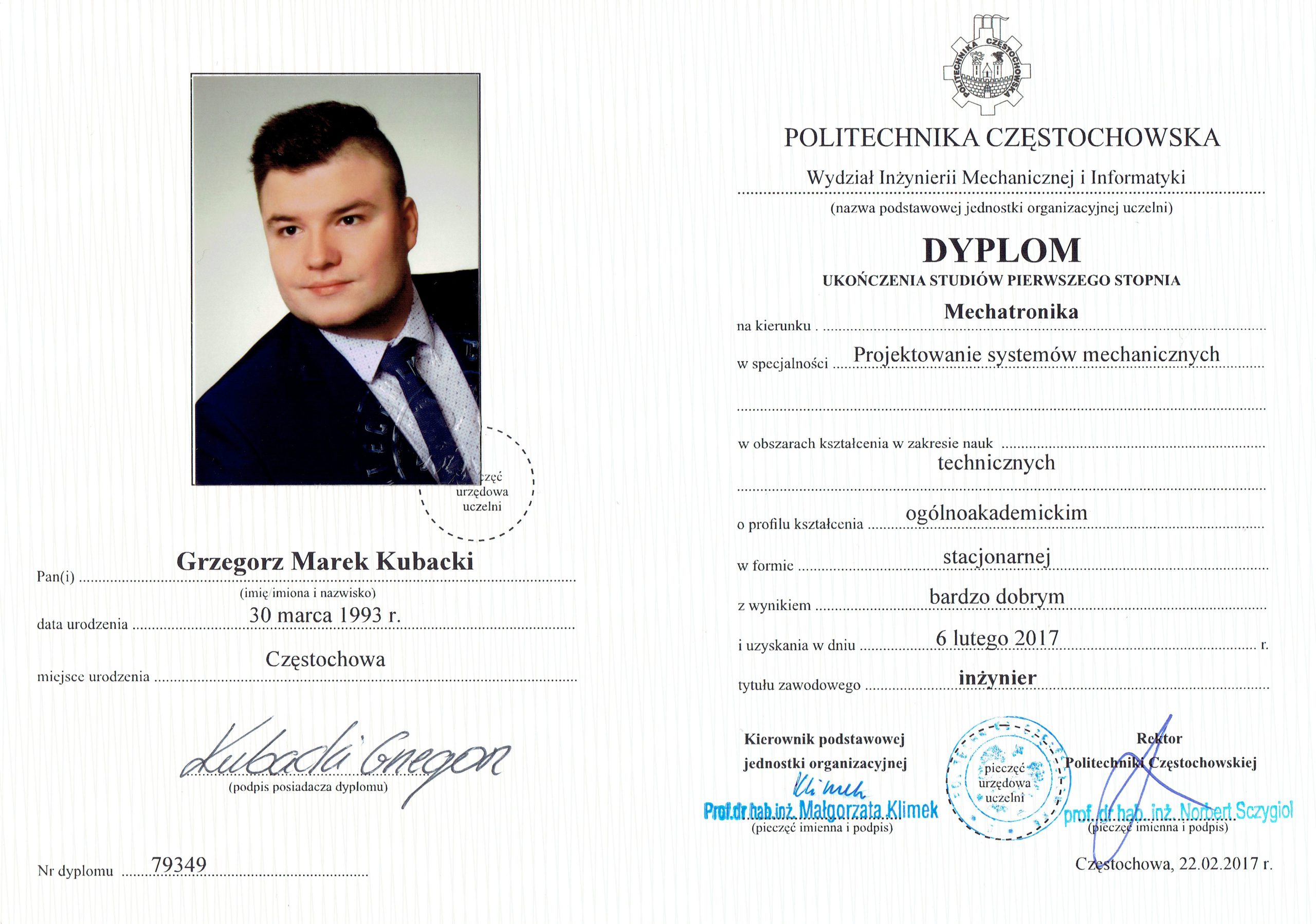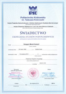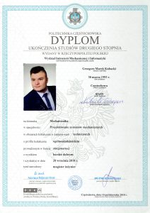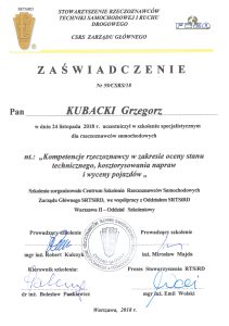 w zakresie ekspertyzy i rekonstrukcji wypadku drogowego, techniki samochodowej i wyceny wartości pojazdów oraz jakości i kosztów napraw powypadkowych. Posiadam wykształcenie wyższe – studia inżynierskie oraz magisterskie na kierunku technicznym „MECHATRONIKA” w specjalności „PROJEKTOWANIE SYSTEMÓW MECHANICZNYCH”. W 2018 roku ukończyłem studia podyplomowe w dziedzinie „EKSPERTYZA WYPADKU DROGOWEGO” prowadzone przez Politechnikę Krakowską im. Tadeusza Kościuszki wraz z Instytutem Ekspertyz Sądowych im. Prof. Dra Jana Sehna w Krakowie. Ponadto w ostatnich latach ukończyłem szkolenia specjalistyczne dla rzeczoznawców samochodowych organizowane przez Stowarzyszenie Rzeczoznawców Techniki Samochodowej i Ruchu Drogowego na temat: