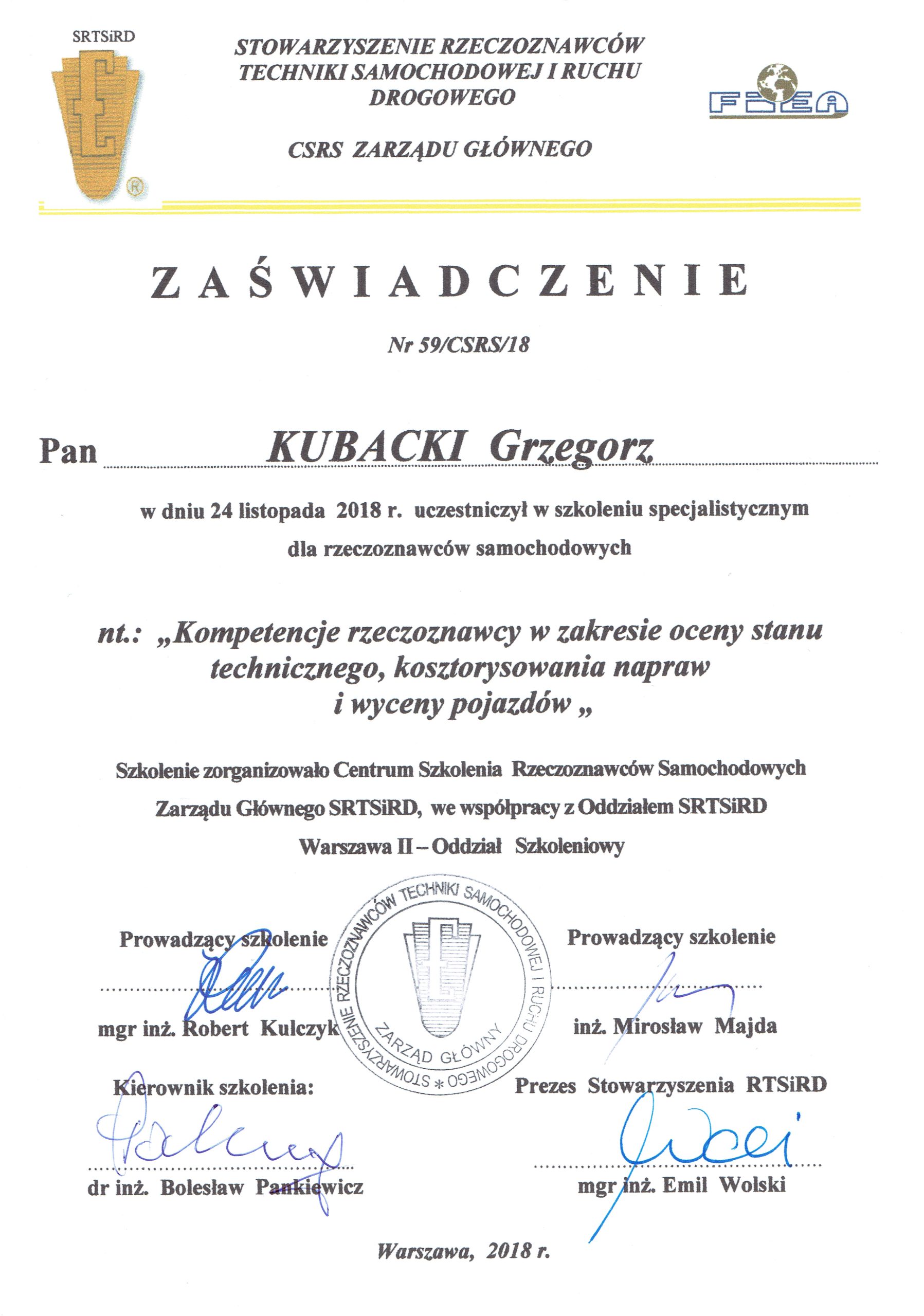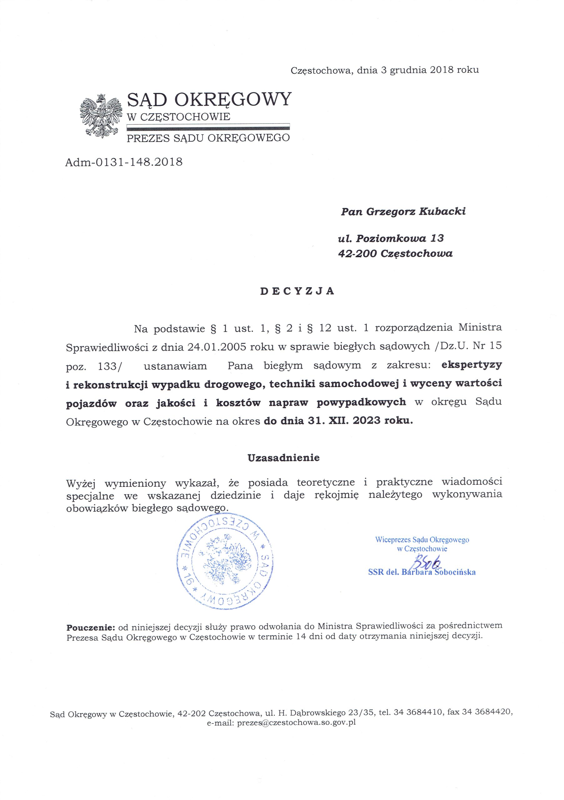 Rzeczoznawca Samochodowy Stowarzyszenia Rzeczoznawców Techniki Samochodowej i Ruchu Drogowego oraz Biegły Sądowy Sądu Okręgowego w CZĘSTOCHOWIE